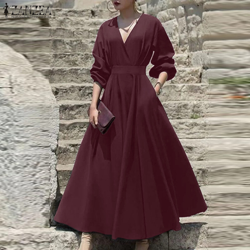 ZANZEA Womens Puff Long Sleeve V Neck Plain Fashion Party Evening Swing Maxi Dress #11