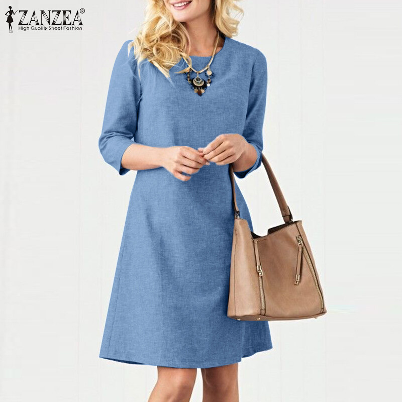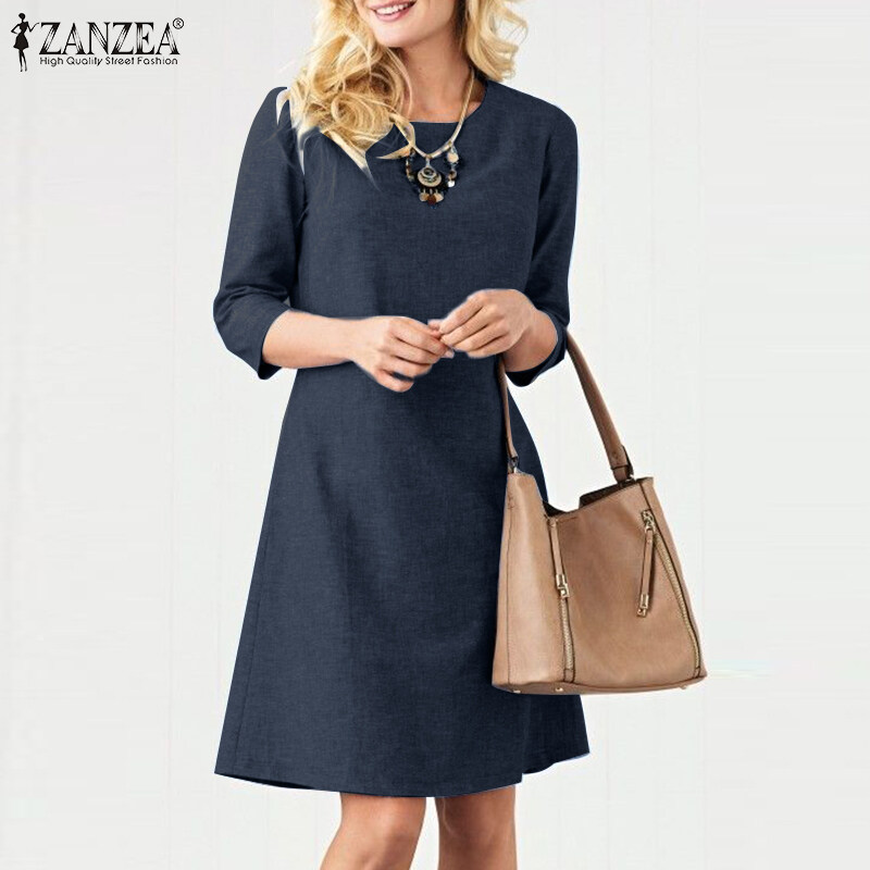 ZANZEA Women Vintage Simple 3/4 Sleeve Midi Dresses Loose Solid Round Neck Sundress #15
