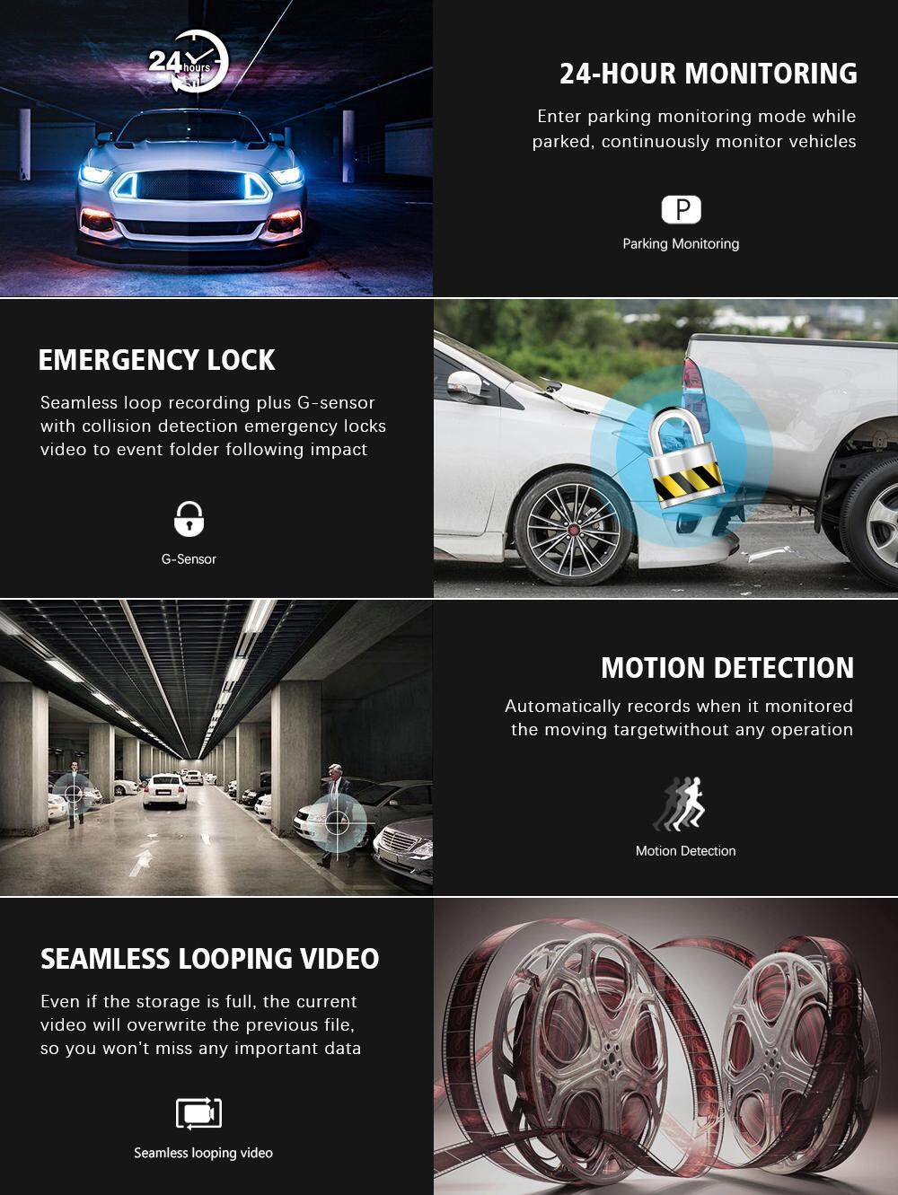 Dual Cam DVR front camera and rear camera can make a recording at the same time and have two split-view display. Full HD 1080P front camera with 140° wide-angle, and 720P rearview camera with 120° angle.